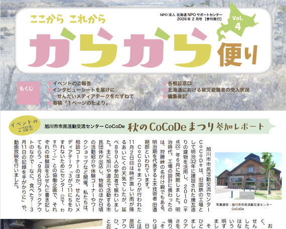 からから便りVol.4発行しました。 2026年2月12日nposc_staffお知らせ からから便りVol.4を発行しました。11月2日(日)に参加した、旭川市市民活動交流センターCoCoDe主催の Read More